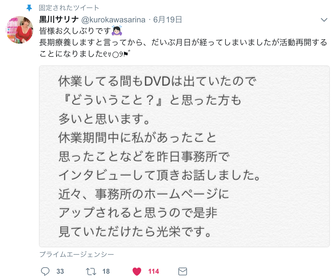 而對其事務所「Prime」來說好消息還不只如此,之前以健康因素為由無限期中止活動的黒川サリナ(黑川紗里奈)不久前也宣布完治回歸,不只更新了twitter了也上了媒體和大家見面…這年頭新人不足,各個經紀公司都經營的很辛苦,一下子多兩個戰力回歸,Prime雖然還不到滿血的程度但戰力絕對提升不少,當隻血牛沒問題的~