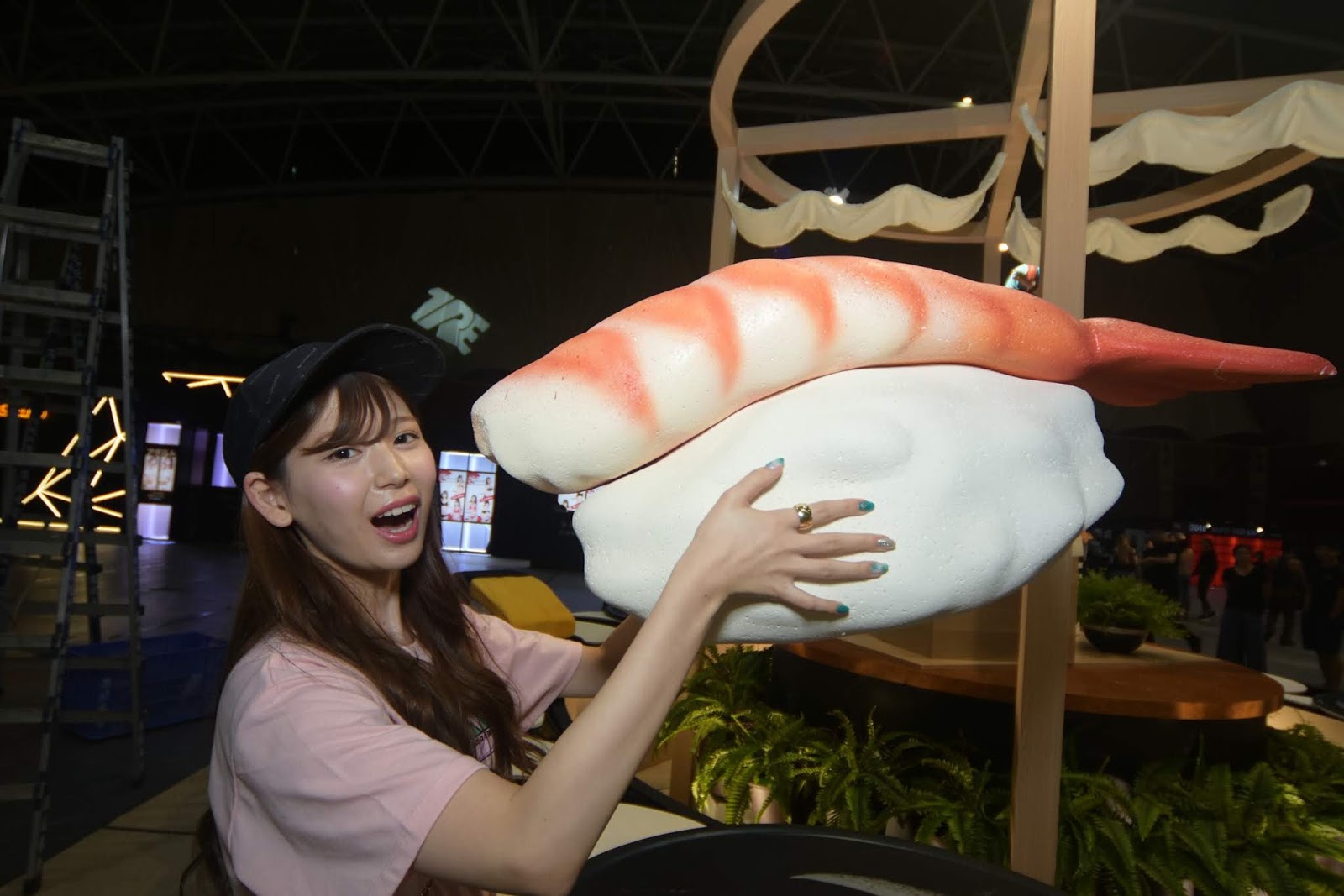 但和明里つむぎ(明里紬)合作兩天下來我倒是改觀不少:第一,她很敬業,攝影會的前置作業是很累的,但我從沒聽她喊累,甚至還主動戴起鯛魚燒的帽子說要這樣去拍攝影會;第二,原本看她紙片人的身材我還真怕她什麼都不吃,但第一天我就歪打正著點了一堆她喜歡吃的海鮮,結果她吃得比我還多,啤酒都乾杯了好幾次呢~