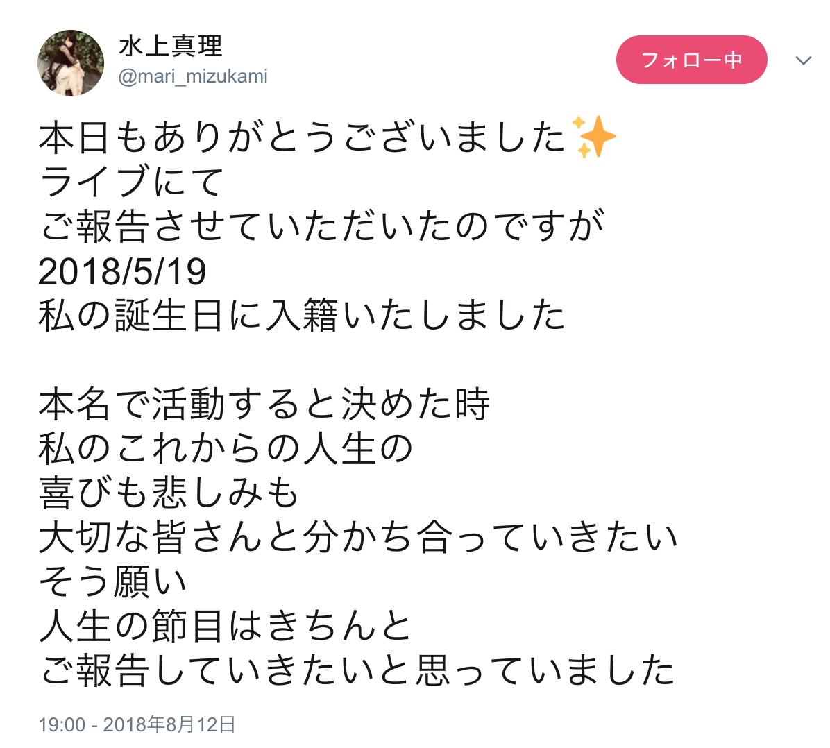 婚後的她還是會繼續自己的音樂之路,因為那是她的最愛;至於她老公是誰呢?現在叫水上真理的她沒說,我想也不用特別去查,而以她過去與波多野結衣、佳苗るか(佳苗琉華)及神咲詩織等人的交情來看,我想過去這些團員應該都知道老大的好消息並且給予祝福了~