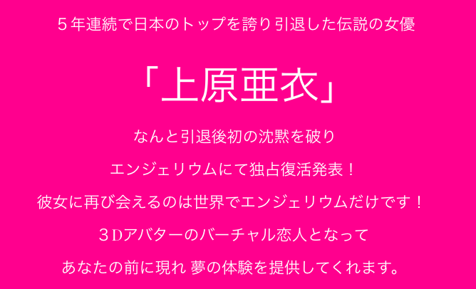 前面已經說了,這是個限定復活的企劃,但問題是上原亜衣要做到什麼程度呢?網站上說了,她將會以3D虛擬實境戀人的形式出現在大家面前,也就是說各位要戴上VR裝置,藉由3D技術與她互動~