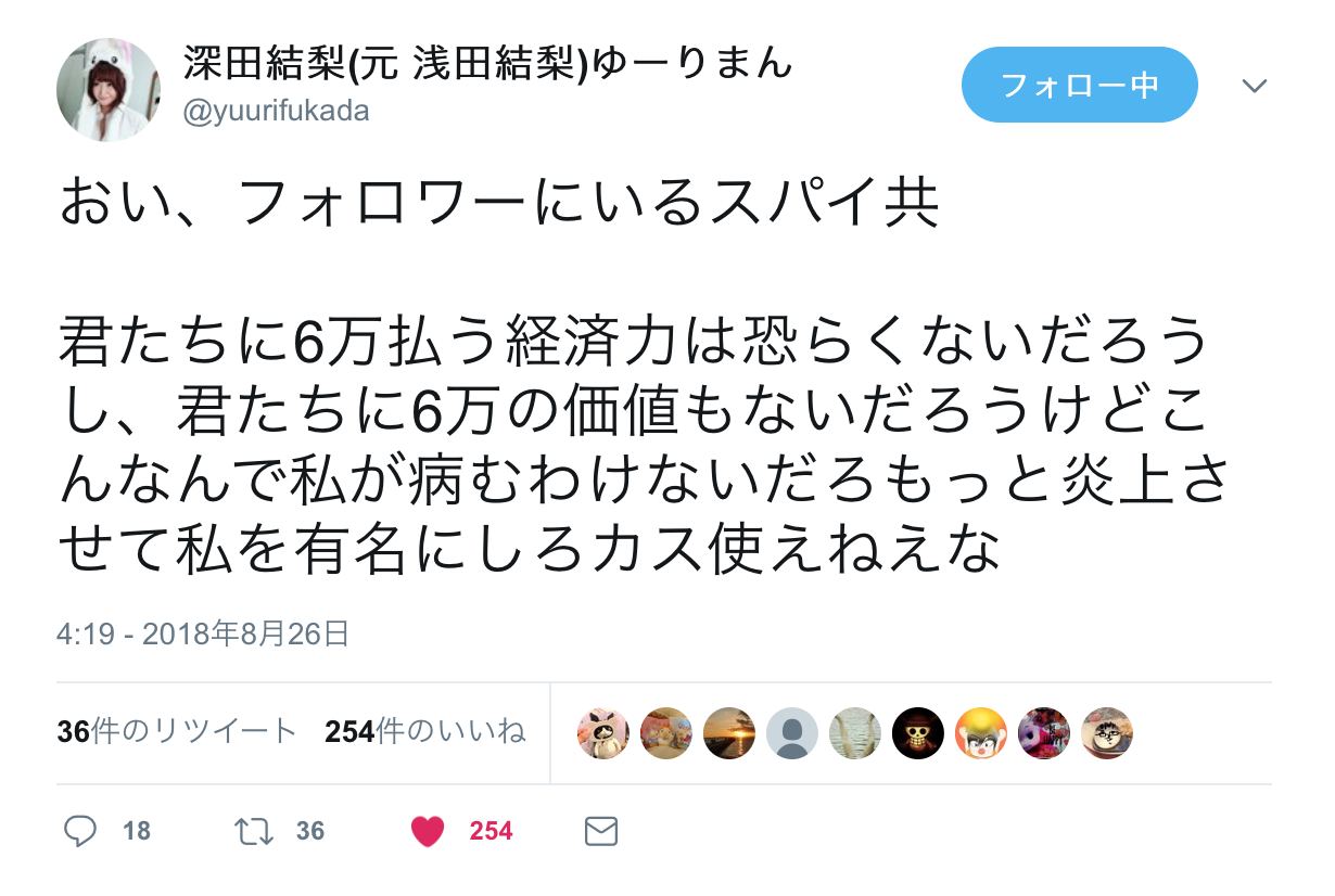 所以我認為她是用激烈的文字武裝自己,但她本人完全沒有任何攻擊力;只是話說回來,不管怎樣被酸,發這種文字總是不太好,深田結梨還是好好修心養性,老是讓twitter戰成一團不會是好事的…