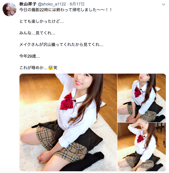 等到什麼呢?如果各位有追蹤秋山祥子的twitter就知道在6月中的時候她Po了一系列穿上學生服的照片,雖然在AV界女優扮演女學生可說是稀鬆平常,不過別忘了,秋山祥子可是出道9週年的資深女優了,近年來隨著外型愈來愈成熟應該沒人會把她和學生服連在一起,這次換上這套AV界的黃金聖衣肯定有問題…