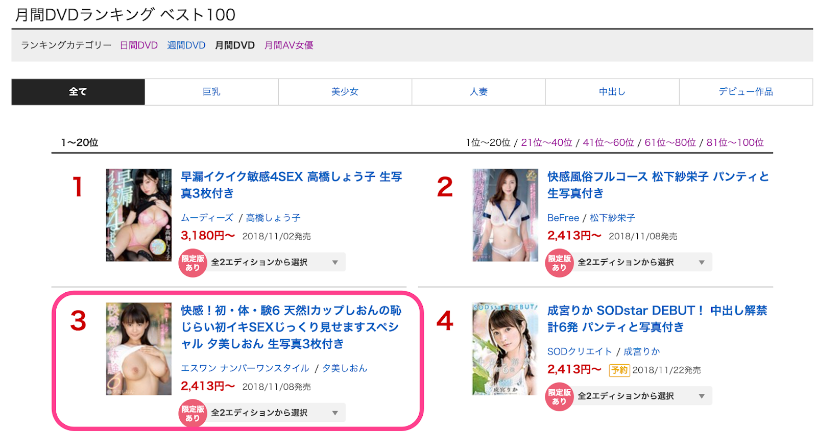 這說明了什麼?很簡單,那就是夕美しおん(夕美紫苑)真的會演,不管是天生神力還是下海前去了表演訓練班都沒關係,鏡頭前的她就是能幹也好幹;再搭配上她甜美的臉蛋、號稱是天然I罩杯的巨乳加上19歲、膠原蛋白還沒流失的年輕肉體,就算個子小了又怎麼樣?夕美しおん(夕美紫苑)一樣勢如破竹直衝排行榜榜首: