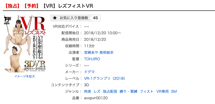 由剛剛才發表AV引退宣言的「宮崎あや(宮崎彩)」與美咲結衣演出的「レズフィストVR」就是最好的例子:從標題就知道這支作品有兩大重點,第一個重點是「レズ」、也就是說這支VR片沒有男優參戰,就是由宮崎あや(宮崎彩)和美咲結衣一打一;另一個重點則是「フィスト」,這個單字的意思是拳頭,也就是說這是一支「鐵拳對鋼拳」的作品: