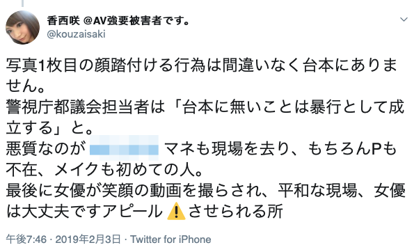 不久前,她才在twitter上痛罵男優「森林原人」:從twitter上的圖就知道那是已經被下架的作品「イラマチオ奴隷志願 仕事のできないOLは、優秀な口便器」,香西咲說森林原人踩著她的頭強迫她替另一位男優口交的演出在劇本上根本找不到,而她請教過日本警視廳對方也告訴她這樣的行為涉及犯罪ー