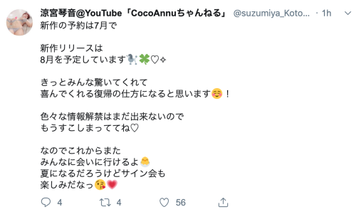 是啦,身為一個AV女優,回去拍片本來就是涼宮琴音應盡的責任,不過話說回來,如果你和我一樣長期追蹤她的動向就知道在這段時間她做了很多嘗試:不用提與影迷同歡的OFF會和一對一的攝影會了,她與妹妹若月まりあ(若月瑪麗亞)搞了個YouTube的頻道、也與直播業者合作還積極向海外發展…只是做到現在她還是回去拍片你應該就明白些什麼了: