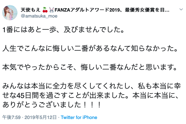 然後她就發了這篇文,明白告訴大家「超不甘心的」、然後放話回去要好好檢討失敗的原因:其實我覺得天使もえ(天使萌)也很努力了,她和相沢みなみ(相澤南)在日本的人氣應該是在伯仲之間,最大的差距是在海外: