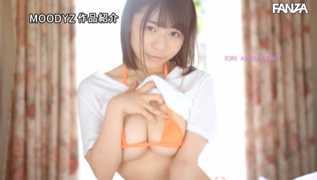 她就是由寫真女星轉職解禁的「有栖いおり(有栖伊織)」,所以看到下半身剃得清潔溜溜別以為是她討厭黑森林的存在而是拍攝寫真的需要。也因為之前拍過寫真,所以Moodyz除了強調這位新人的資歷外還把作品取名為「AV解禁」、昭告天下她真的被插進去了…