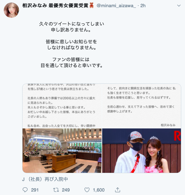 為什麼呢?在今天,相沢みなみ(相澤南)告訴了大家答案,與她相知相惜、一路從出道拼到拿下FANZAアダルトアワード(FANZA成人大賞)的社長,往生了。