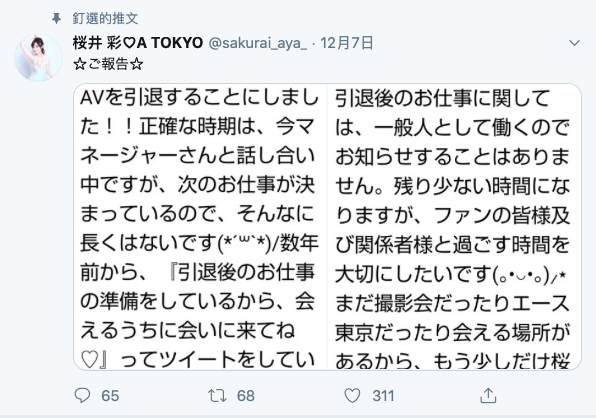 但桜井彩的狀況和大家完全不同:在去年3月(2018/3),她在twitter上自爆遭到影迷性侵害—雖然嫌犯遭到逮捕並且起訴,但她的身心都出了狀況,不只出現恐慌症、只要情緒緊張就會出現哮喘的症狀,案件發生後她就視進棚拍片為畏途: