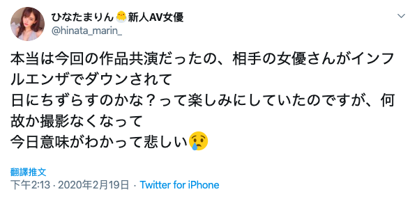這就是事情的真相。而且就我的了解,雖然高層都知道女優要走(你看看橋本的消息多早就曝光了),但原先安排好的拍片計畫還是因此大亂,ひなたまりん(日向真凜)就在twitter爆料,原本有個要和前輩合作共演的企劃,結果臨時收到前輩中了流感的消息取消拍攝,今天才知道是怎麼回事:
