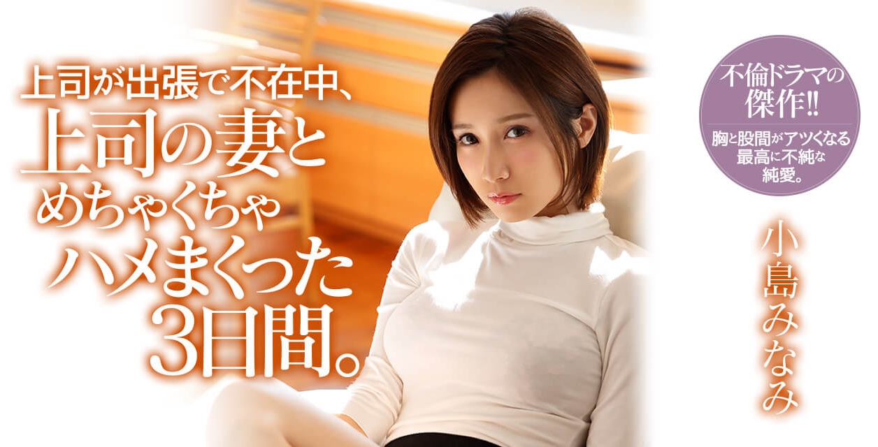 至於這支被片商稱為不倫ドラマの傑作(不倫戲的傑作)的作品「上司が出張で不在中、上司の妻とめちゃくちゃハメまくった3日間。」在演什麼呢?標題已經說了,就是上司不在、我睡了他的老婆,但也別誤會了,那不是男優呲牙裂嘴、把哭著說不要的小島みなみ(小島南)生吞活剝玩爽爽,而是小島みなみ(小島南)趁著老公不在狂啃小鮮肉,一次又一次,把小鮮肉的蛋蛋吸到萎縮⋯