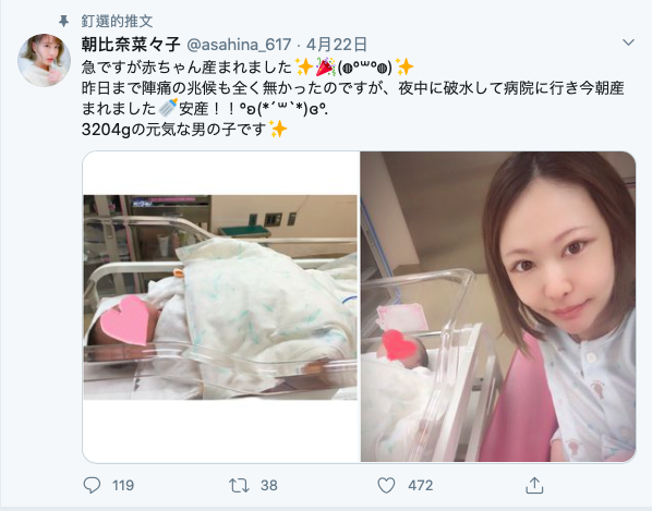 沒錯,這是貨真價實的「孕婦片」,無碼片拍得很多、藝名也用了一大堆的朝比奈菜々子是真的懷孕了,為什麼我敢這麼肯定呢?因為不久前她在自己的Twitter上告訴大家小寶寶出生了~