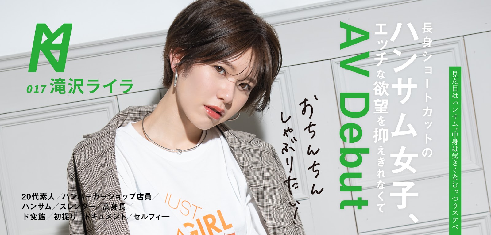 對,沒錯,SOD的子品牌KMHR是以ハンサム(英俊)來形容這位賣漢堡的女孩:和小岩いと(小岩伊都)完全不同,也是短髮造型的滝沢ライラ(瀧澤萊拉)皮膚白晰身形高挑,坦白說,這位新人說是賣漢堡的我還真不信,她明明很像坐在辦公室狂譙部下的新聞部主管,「霸道」這個形容詞比較適合她,「英俊」兩字放在她身上有點怪怪的;不過可別以為這樣外表的她對性愛沒什麼興趣,相反地,滝沢ライラ(瀧澤萊拉)是個妄想女子,每天都在幻想自己被插到痙攣的樣子⋯