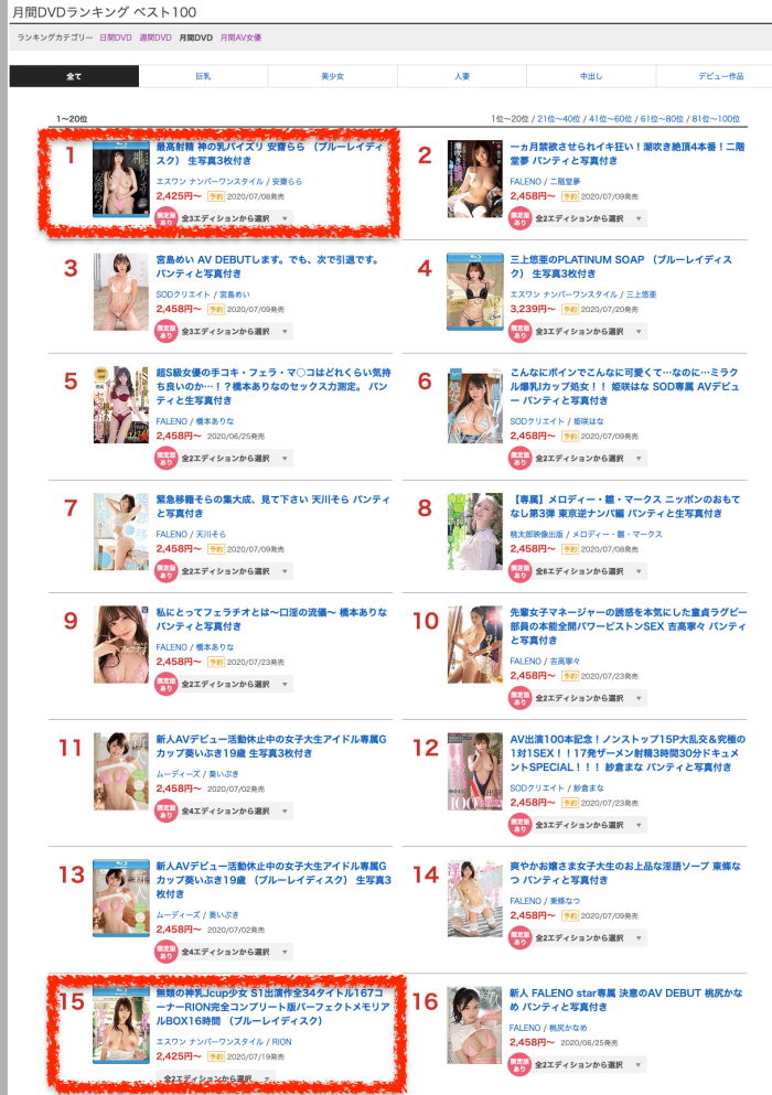 這還是很厲害啦,安齋らら(安齋拉拉)雖然在累積銷售排行榜只排在第二,但她的新作「最高射精 神の乳パイズリ」卻是上個月最暢銷的作品,至於RION的超級精選輯則是排在第15,這位有神乳之名的女優到底有多厲害就不必我多說了〜