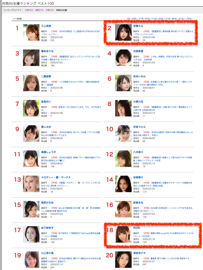 結果6月通販排行榜的女優部門(作品累積銷售排行)是長這樣的:首先,安齋らら(安齋拉拉)並沒有連霸拿冠軍,她「只拿到了第二名」;而RION的精選輯雖然很威但並沒有拿到前10,而是以第18名作收: