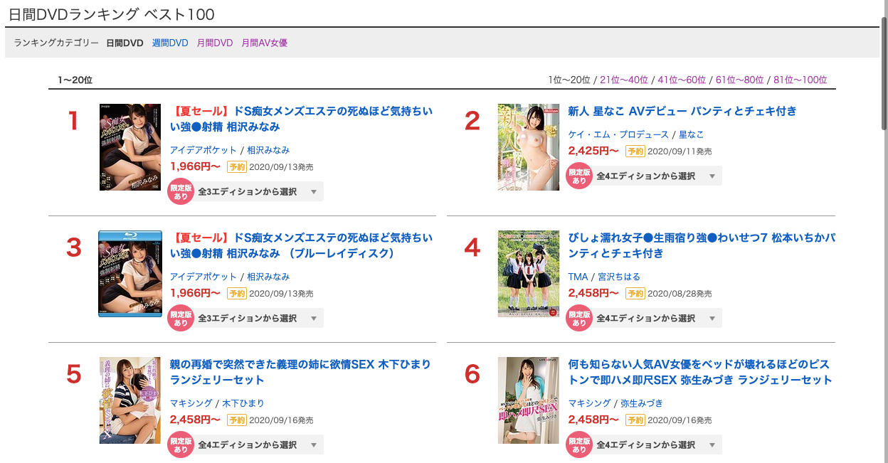 首先,這支13日上架的作品賣得有多好呢?昨天(8/18)它是拿下了第一(DVD版)和第三(藍光版),這也是相沢みなみ(相澤南)連續3天拿下第一,其中又以前天(8/17)直接拿下第一第二的成績最為暴力;而沒有拿下第一的那幾天呢?15號她是拿下第三第四,14號她是DVD版排在第二,13號呢?她的DVD版是排在第三,也就是說這支作品從上架從來沒掉出前5,而且已經連續3天是兩個版本的作品同時打進前5名⋯