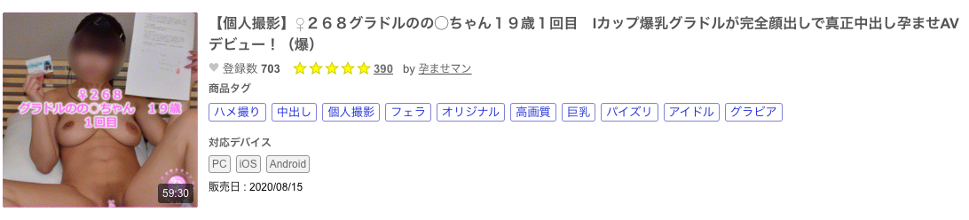 但也不是每個神乳都混得很好,曾經在作品封面被標上神乳的原花音最近就被抓到拍了無碼片,那就是在影音網站FC2發行的「【個人撮影】♀268グラドルのの◯ちゃん19歳1回目 Iカップ爆乳グラドルが完全顔出しで真正中出し孕ませAVデビュー!(爆)」,雖然賣家又是噴霧又是塗鴉的遮掩她的身分,但一到片子裡就真相大白了: