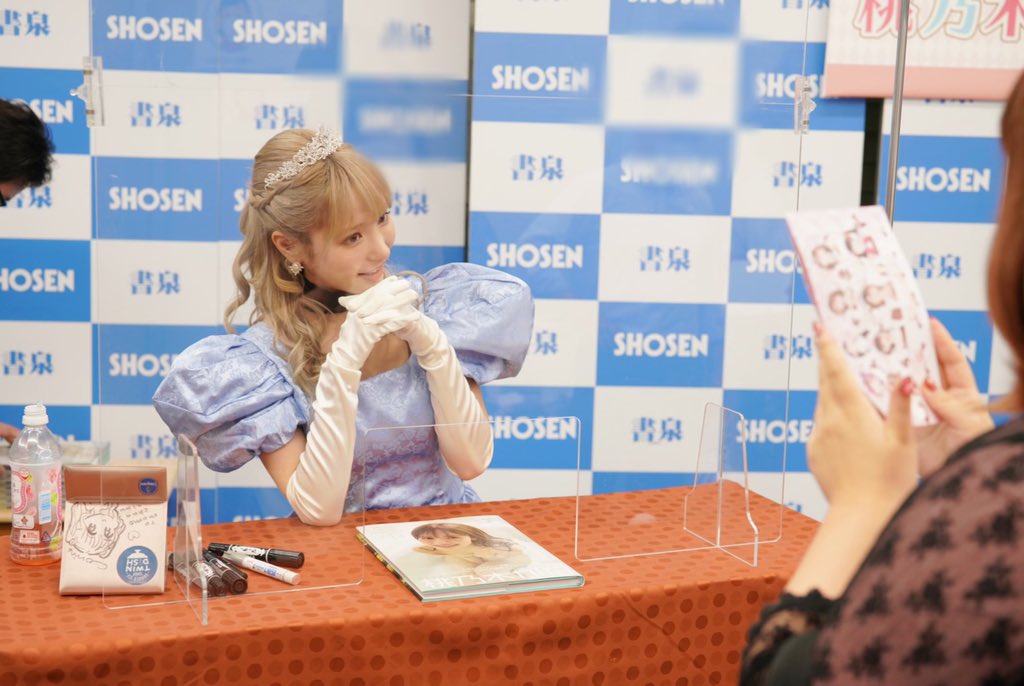 店舖是用透明的壓克力板搭起了隔間,讓桃乃木坐在裡面和粉絲互動:桃乃木也誠意十足,坐在裡面換了兩套衣服像個小公主似的和影迷見面: