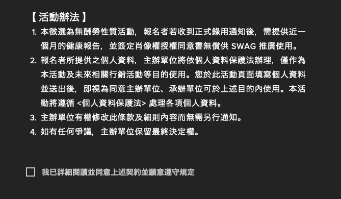不管你是高大威猛還是短小精悍,SWAG要的就是你,趕快上報名頁面或是掃描QR Code就可以報名。如果你不怕露面、如果你天生巨炮難自棄想要大家知道,那就趕快報名,歡迎你用下半身打拼自己的性福喔〜