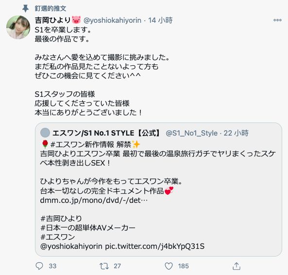 是的,意思就是這支作品拍完她就要離開S1了:這有蠻多可以討論的地方,首先,S1本來就不是個女優只進不出的地方,一般來說女優一開始會簽一張3~6個月的專屬契約(當然,有些女優的合約會更長,但不是人人都是一年),合約到期後會視銷售的狀況決定中止合作或是續約再戰;再來,S1不是一個好待的地方,從之前辻本杏的爆料就知道沒有一定的銷售水準就會被減薪會是掃地出門了;最後,先不管吉岡畢業的原因是什麼,能在S1專屬發片超過15支作品已經很強了,考量到她後面的經紀公司規模,我覺得吉岡是超厲害〜