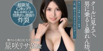 在拍AV前她是舞蹈老師,我想這是片商為了要帶出她的好身材而做的設計:我們知道喜歡跳舞的女孩大多身材健美,星咲リサ(星咲梨紗)自然也不例外ー文案一開始就說了,這位新人擁有「超新星G罩杯」以及「完全無欠の美尻」,前凸後翹讓人好生激動;而且不只身材暴力,在床上的她更是兇殘,片商說外表像是個冰山美人的她一看到男優就張開領域如野獸般獵食男優,撲倒對手,用小穴壓制他們的肉棒,臨兵鬥者皆陳列在前的上下左右瘋狂套弄: