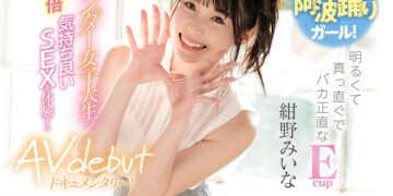 封面寫了,她有很迷人的笑容,而且還是阿波踊(阿波舞)的舞者,所以紺野みいな(紺野美衣奈)會換上舞者的衣服登場;另外,一不只新鮮而且還是青春肉體的她擁有E罩杯的好身材,之所以加入AV界是因為想尋求更強烈的快感⋯
