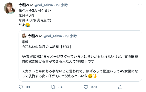 可能是怕大家以為自己開玩笑,令和れい(令和玲)緊接著爆料說自己不只上個月沒賺到錢,再上個月也只有3万円(台幣7500元),而這個月到現在為止也是一毛錢都沒有。其實很多女優有提到AV界根本沒表面那麼光鮮,我想令和れい(令和玲)這爆料應該讓大家徹底見識到這一行有多麼殘酷⋯
