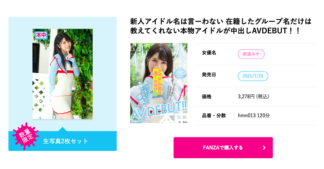 作品名:新人アイドル名は言ーわない 在籍したグループ名だけは教えてくれない本物アイドルが中出しAVDEBUT!!品 番:HMN-013發行日:2021/07/25女優名:新道 みや(新道 美夜,Shindo-Miya)事務所:身高/罩杯:???公分/?罩杯