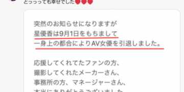 昨天晚上她突然在twitter發文說已經於9月1日引退,理由是「個人因素」ー意思就是不用多說直接不玩,接下來就是感謝粉絲感謝事務所感謝片商,這一年半的時間她過得很開心⋯