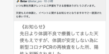 這是BStar第二位成員確診了,之前是沒有拍AV的小夏つむぎ(小夏紬),雖然年紀很輕但她的狀況蠻嚴重的,拖了很久還沒好;而天使もえ(天使萌)確診除了要祝她早日康復外也要密切關注擴散的狀況,因為不只8月28日有實體活動接觸了很多人,隔天她還在社長家裡直播,那時不只社長還有另一個經紀人在場,經紀人如果又去帶其他女優的話⋯