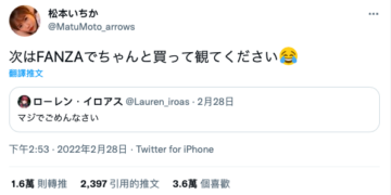 看看這篇在twitter的發文,松本いちか(松本一香)的意思很簡單,就是「下次要在FANZA(DMM)購買觀賞喔」然後加一個笑到流眼淚的表情,結果已經有過3.5萬個讚,還有接近兩萬個轉發⋯