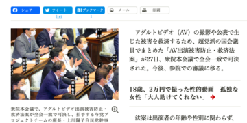 沒錯,這個「AV救済法案」已經在日本眾議院通過並且送往參議院審議,會不會成為定案呢?這個讓我解釋一下,在日本,眾議院被認為比較可以反映民意,地位比較高,眾議院通過的法律如果參議院提出異議,那只要眾議院出席議員2/3以上再次通過就可以成為法律,如果參議院在一定的時間內無法做出決議,也是眾議院的決議說了算⋯