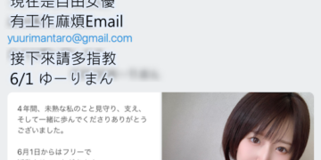 那就是「深田結梨」,在昨天三上宣布獨立的同一時間她也在twitter發表重大決定:退出了事務所Arrows,即日起要以自由女優的身分繼續奮鬥,所以她不再用深田結梨的名字,而是直接用綽號ゆーりまん(Yuriman)活動〜