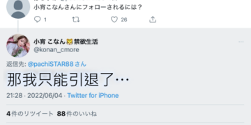 我仔細看了一下,這是小宵こなん(小宵虎南)回覆影迷的留言,這位名叫「ばちすけ」的朋友自2017年5月登錄twitter,到現在超過5年的時間總共追蹤37人,而追蹤他的一共是少少的3人ー之所以講解這位影迷的背景是因為這位連頭像都沒放的影迷(姑且這麼稱呼好了)就只有追蹤小宵這麼一位AV女優,可說全靠小宵照顧他的下半身:
