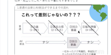 我不是政治觀察家,不過這次選舉和AV界有那麼一點點關係ー上面這張圖說明了新法是如何惡搞AV界的,人家從討論到召開公聽會再到國會通過及公布實施所需要的過渡期大概要三年左右的時間,AV新法是直接跳過第一第二及最後階段直接國會通過就實施,叫大家措手不及⋯