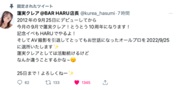 著名的痴女、也曾來到台灣參加成人博覽會及攝影會的女優「蓮実クレア(蓮實克蕾兒)」今天凌晨發表了AV引退宣言,除了不再拍片,在9月25號、出道10週年的時候她也要退出經紀公司AllPro: