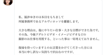 片商E-Body出道、有「神乳」之稱的凪沙ゆきの(凪沙雪乃)在9月12號於twitter宣布要退出事務所アルヴィロッソ(Alvirosso),意思就是要離開AV界了: