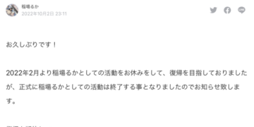 今年二月休業,一直說會回來的「稲場るか(稻場流歌)」昨天在Note上宣布自己食言了,除了和影迷道歉外她也說自己找到了一般的工作,所以⋯