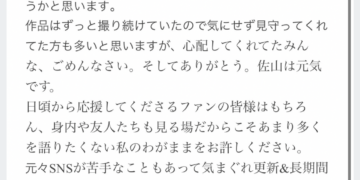 我簡單翻譯一下,佐山愛說自己雖然一直按表操課固定發片,但過去一年半她是進入了半冬眠狀態,原本就不是很擅長的社群幾乎沒有更新,活動也是全都推掉,讓大家擔心了真是不好意思;而現在,她回來了ー