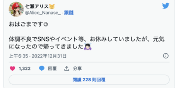 在11月初消聲匿跡的七瀬アリス(七瀨愛麗絲)看起來是完全復活了,繼轉推自己的作品後,她也開始自己更新發文,除了說明前陣子是因為健康狀況不佳專心靜養也感謝影迷在2022年的支持,並請大家今年繼續指教: