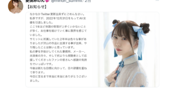 這是很四平八穩的引退宣言,我想老司機們應該都會祝她身體健康,為將來的夢想好好努力。如果要雞蛋裡挑骨頭,那就是愛須みのん(愛須未音)的AV生涯其實不只兩年半,而是四年⋯