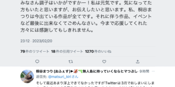 桐谷まつり(桐谷茉莉)也不例外,她先是和大家說聲抱歉,目前在市場上的作品就是她的全部了,她對沒能有新的作品或者和大家好好說再見的活動感到遺憾,對一直支持自己到現在的影迷只有感謝再感謝;然後她話鋒一轉,說最較twitter比較少更新是因為她打算要在3月完全自桐谷まつり(桐谷茉莉)這個角色抽離,社群將要關閉〜