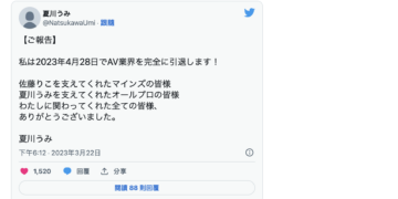 了解她的朋友應該知道,她不只是夏川うみ(夏川海),也是曾以素人作品拿下FANZA年度第一的「佐藤りこ(佐藤莉子)」,所以在引退宣言上她說不管你是自Mine’s(前事務所)就支持佐藤りこ(佐藤莉子)、還是到了AllPro(現在的經紀公司)才支持夏川うみ(夏川海)都沒關係,她衷心地感謝你的支持,只是現在,說再見的時間已到〜