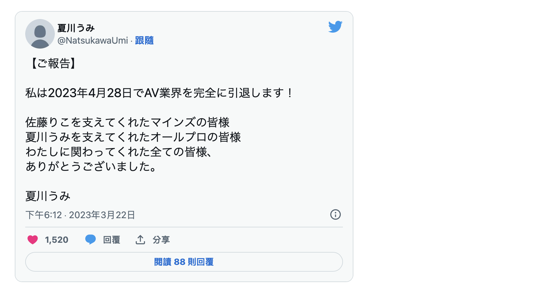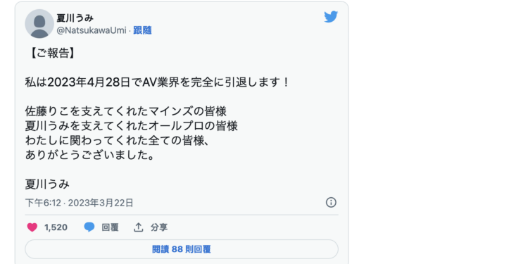 這就是很多AV女優的寫照。不過這次引退,夏川うみ(夏川海)倒是講出了一些以前我不知道的事:首先,她先清空twitter、拿掉頭像、在感謝完影迷的支持後她說了,引退後她就會登出,不再發表任何文章,也不會另外創建帳號,就是讓夏川うみ(夏川海)這帳號閒置了:
