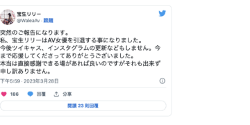 除了離開AV界,宝生リリー(寶生莉莉)也說未來不會再更新twitter及IG,只是因為無法舉辦活動向粉絲們面對面表達感謝之意,所以她只能藉著這篇引退文感謝大家長久以來的支持⋯
