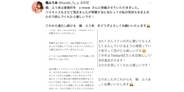 至於為什麼在昨天晚上才告訴大家呢?很簡單,因為昨天(4/20)是楓ふうあ(楓富愛)的生日,C-More是故意等到這時候才宣布她移籍的消息,因為這象徵著她迎接新生ー只能說C-More真有心,真是做足面子給楓ふうあ(楓富愛),而且這次宣布移籍的方式也蠻有意思的,C-More是由社長開直播和大家介紹楓ふうあ(楓富愛),藉由兩人對談讓大家更了解楓ふうあ(楓富愛)的底細: