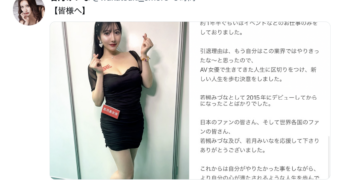 看到聲明後我馬上發了訊息向經紀人致意,對方說若月みいな(若月美衣奈)是很滿足地為自己的生涯畫上付止符,和拳王一樣沒有任何遺憾,但就像她在X上所寫的,如果你想知道不再是AV女優的她接下來的日常生活那歡迎去追蹤她另一個X的帳號,而她原先這個若月みいな(若月美衣奈)的帳號將會在不久後刪除ー