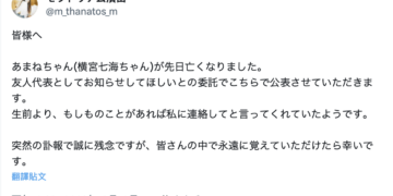 片子還是有出,但社群完全沒動靜了,也讓不少人開始擔心她的AV生涯是不是出了什麼狀況,不過昨晚在X上,友人モラトリアム濱田(https://twitter.com/m_thanatos_m)代為宣布横宮七海在前幾天去世了,葬禮或參拜等的形式目前還沒確定,也不清楚她的家人打算怎麼做⋯
