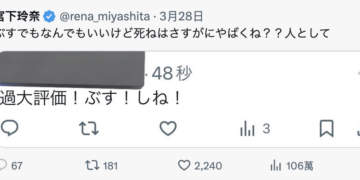 不過這次她好像沒那麼受傷了,轉推這個沒風度的留言時宮下只回文:「身而為人,隨便叫人家去死好像不太好吧?」